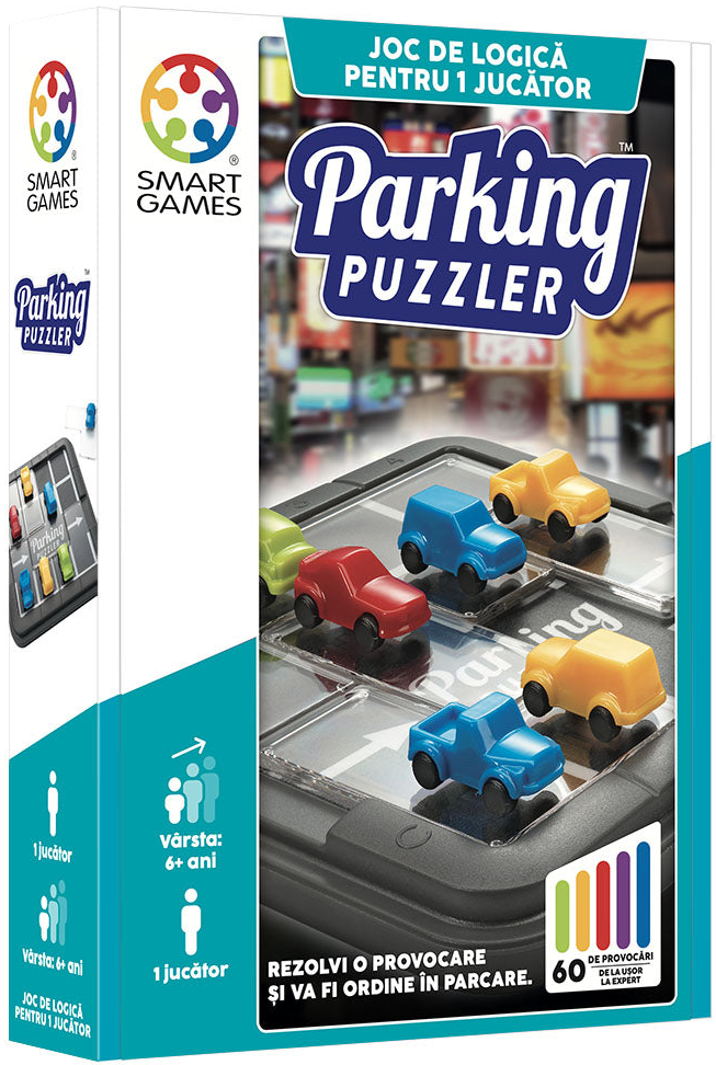Parking Puzzler este un joc de logica cu provocari tip puzzle glisant, din seria Smart Games, de inalta calitate, cu un design incantator si 60 de provocari logice cu dificultati crescatoare, recomandat pentru varstele 6+, care testeaza si dezvolta abilitatile cognitive ale jucatorilor.
