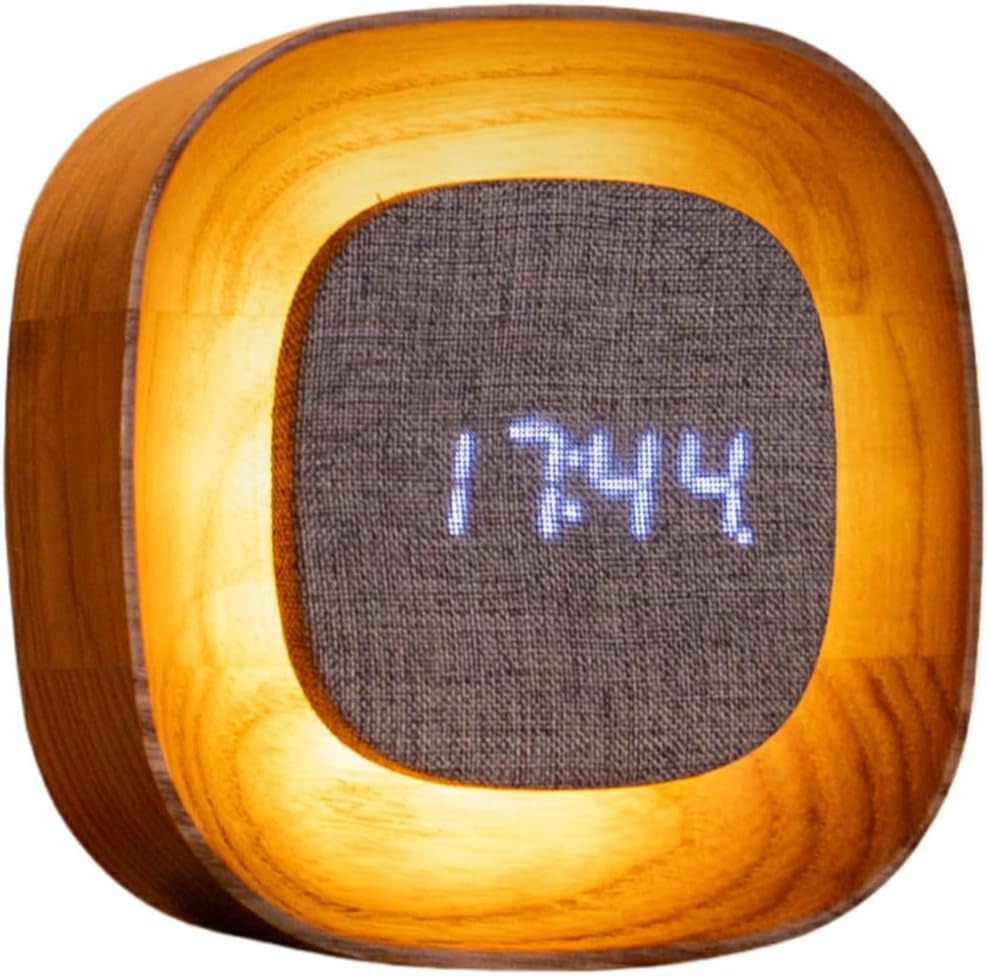 Ceasul Lumos este disponibil în două siluete rafinate – Ovală și Pătrată – și este realizat în două finisaje elegante la alegere: Nuc cald sau Frasin alb minimalist. Ecranul său moale, acoperit cu țesătură textilă, se îmbină perfect cu rama solidă din lemn masiv, obținând un aspect modern, dar organic, potrivit oricărui decor.