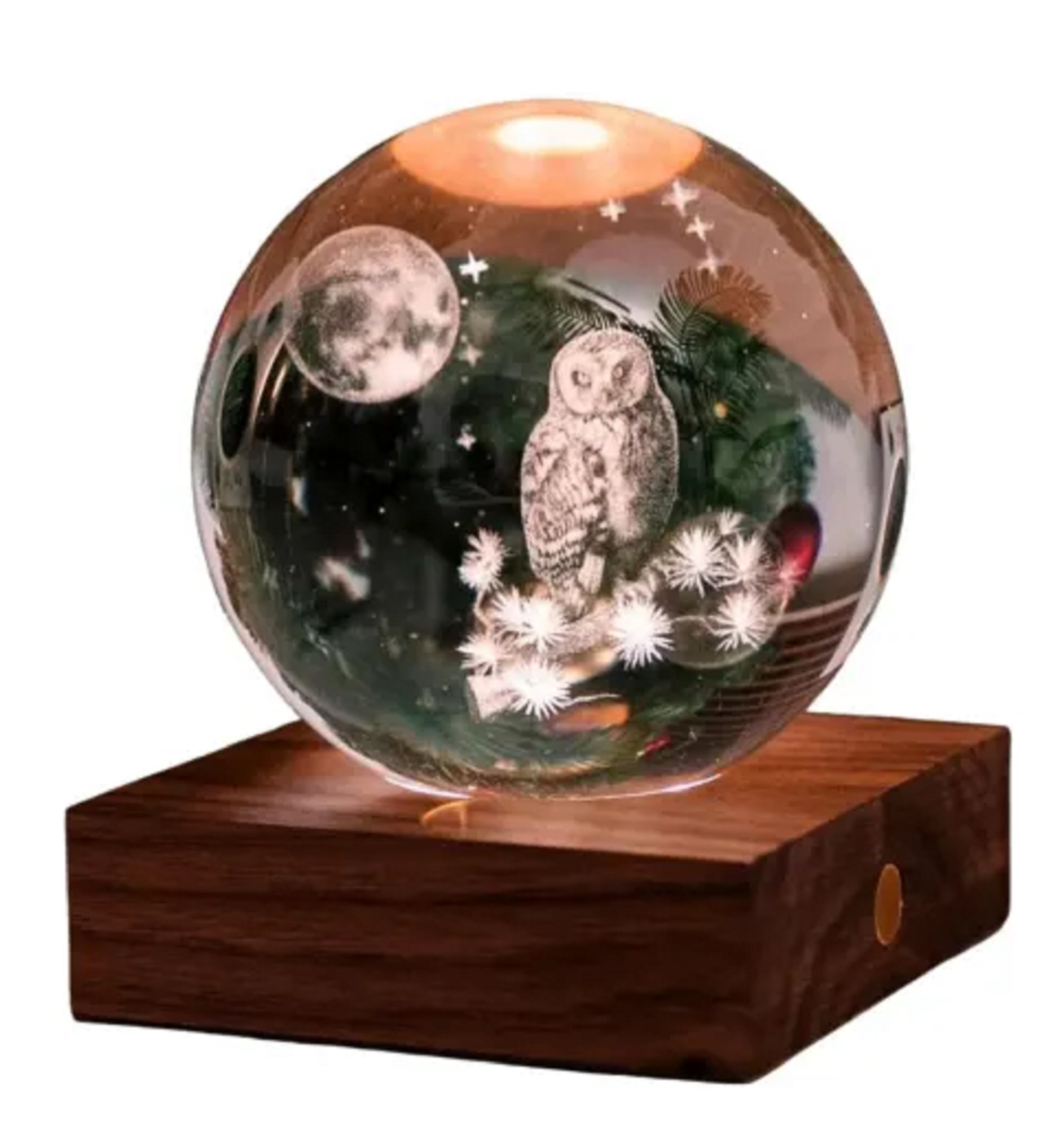 Lampa - Owl Moon este așezată pe un suport de lemn de nuc.