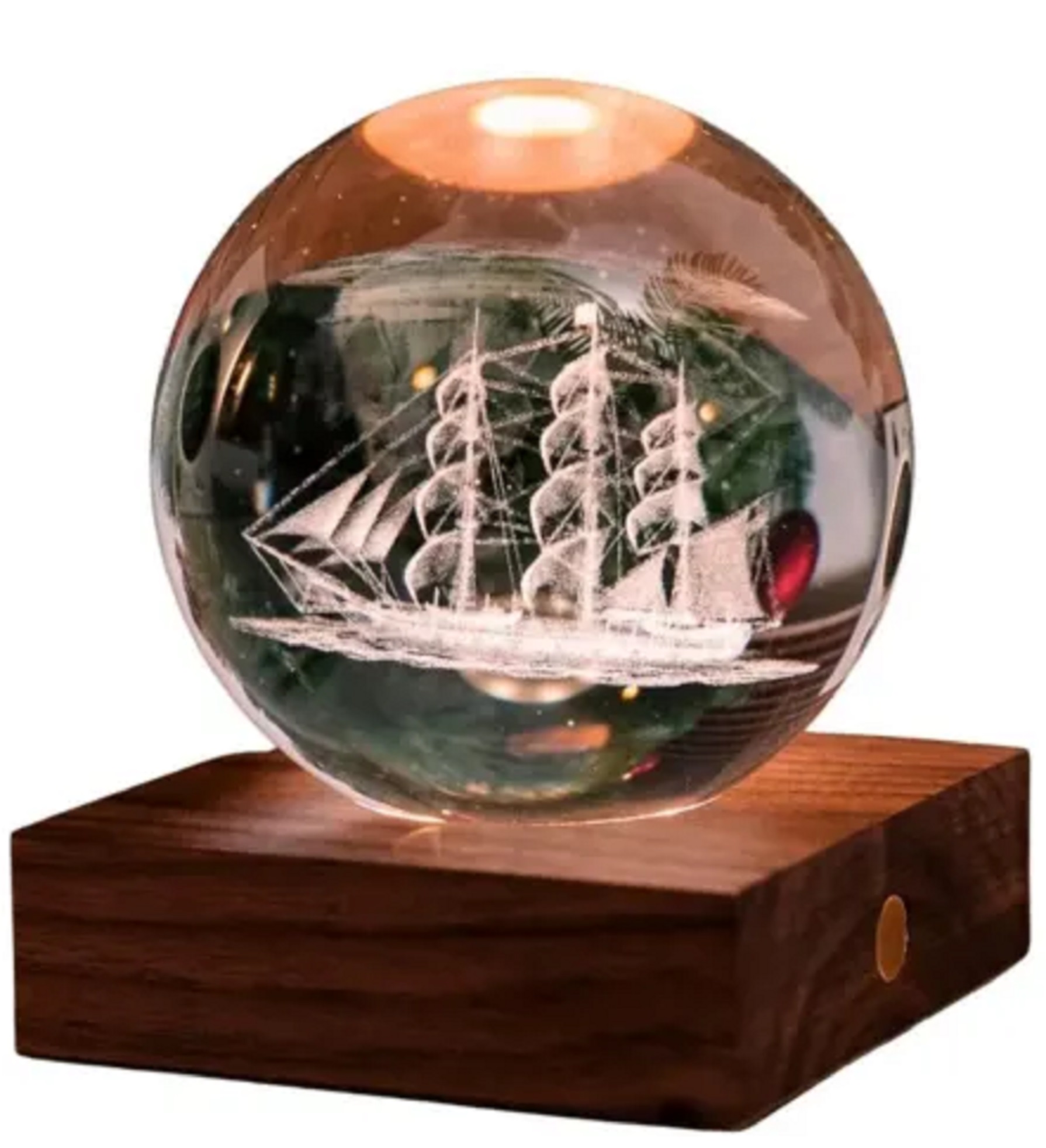 Lampa - Barca de pescuit este realizată din plastic, dar este așezată pe un suport din lemn de nuc.