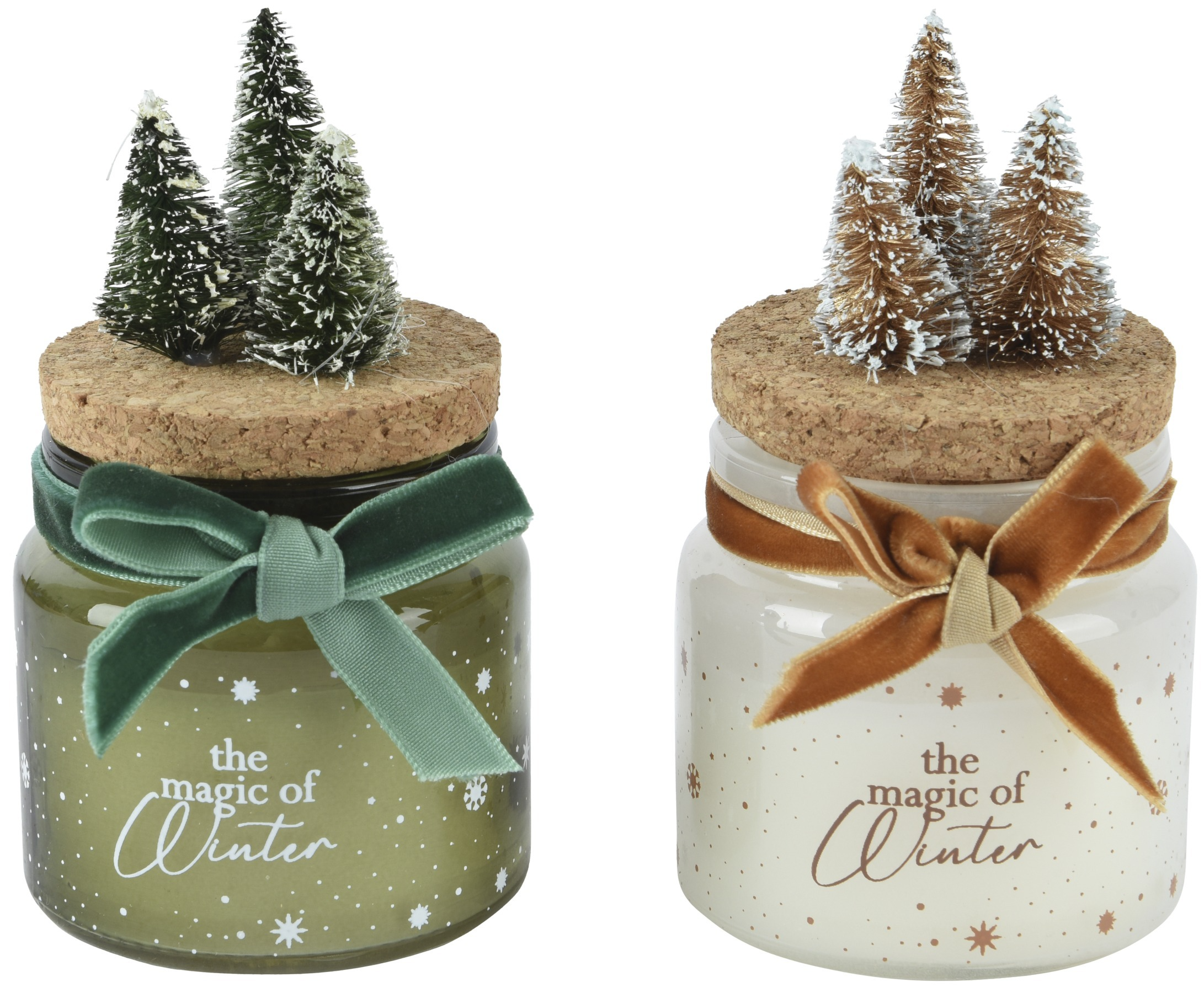 Recipient din sticlă reutilizabil, cu capac decorat cu brăduți.
