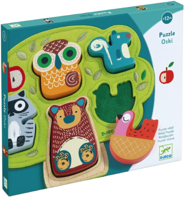 Oski este un puzzle cu tematică forestieră. O bază din pâslă imprimată, plăcută la atingere, în formă de copac, cu detalii brodate și 5 animale din lemn de fixat prin încastrare.
